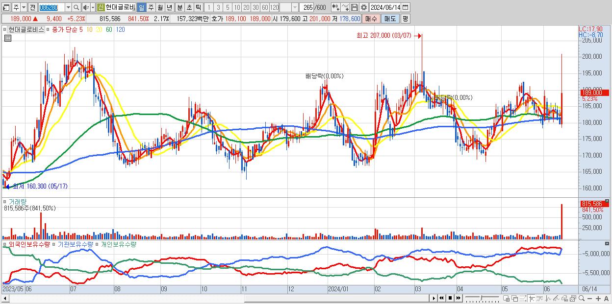 - 현대글로비스 (189,000원 ▲ 5.23% , 시총: 70,875억, 거래량: 815,586, 거래대금:1,573억)