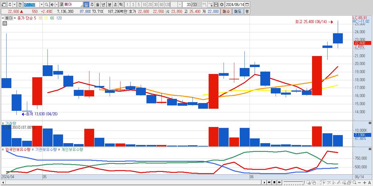 - 삐아 (22,600원 ▲ 2.49% , 시총: 2,188억, 거래량: 7,136,393, 거래대금:1,673억)