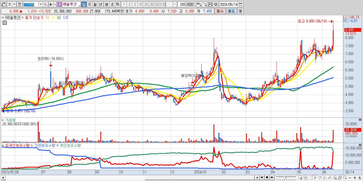 - HB솔루션 (8,480원 ▲ 13.52% , 시총: 6,200억, 거래량: 20,368,083, 거래대금:1,734억)