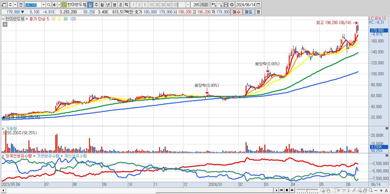 - 한미반도체 (179,900원 ▼ -4.81% , 시총: 174,492억, 거래량: 3,293,200, 거래대금:6,135억)
