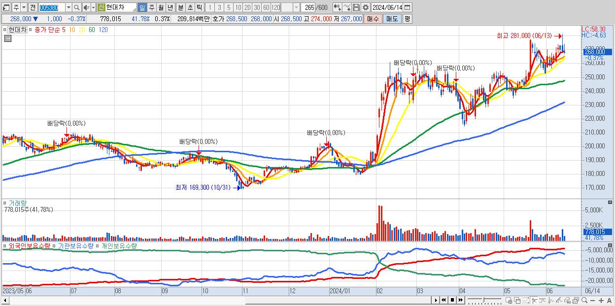 - 현대차 (268,000원 ▼ -0.37% , 시총: 561,235억, 거래량: 778,015, 거래대금:2,098억)