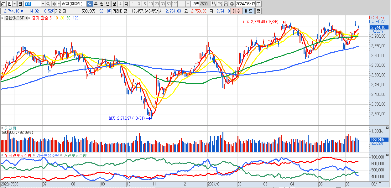 | 06/14 | 2,758.42 | ▲0.13% | -2,136억 | 7,295억 | -4,672억 | -487억 |