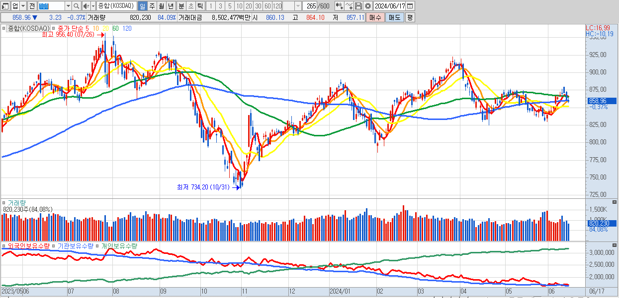 | 06/10 | 864.71 | ▼-0.17% | 249억 | -1,408억 | 981억 | 178억 |