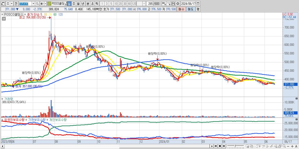 - POSCO홀딩스 (371,000원 ▼ -2.37% , 시총: 313,759억, 거래량: 389,824, 거래대금:1,452억)