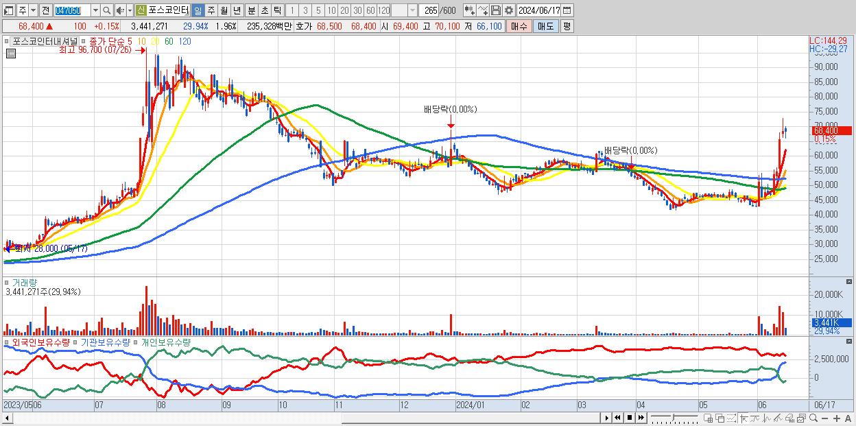 - 포스코인터내셔널 (68,400원 ▲ 0.15% , 시총: 120,331억, 거래량: 3,441,271, 거래대금:2,353억)