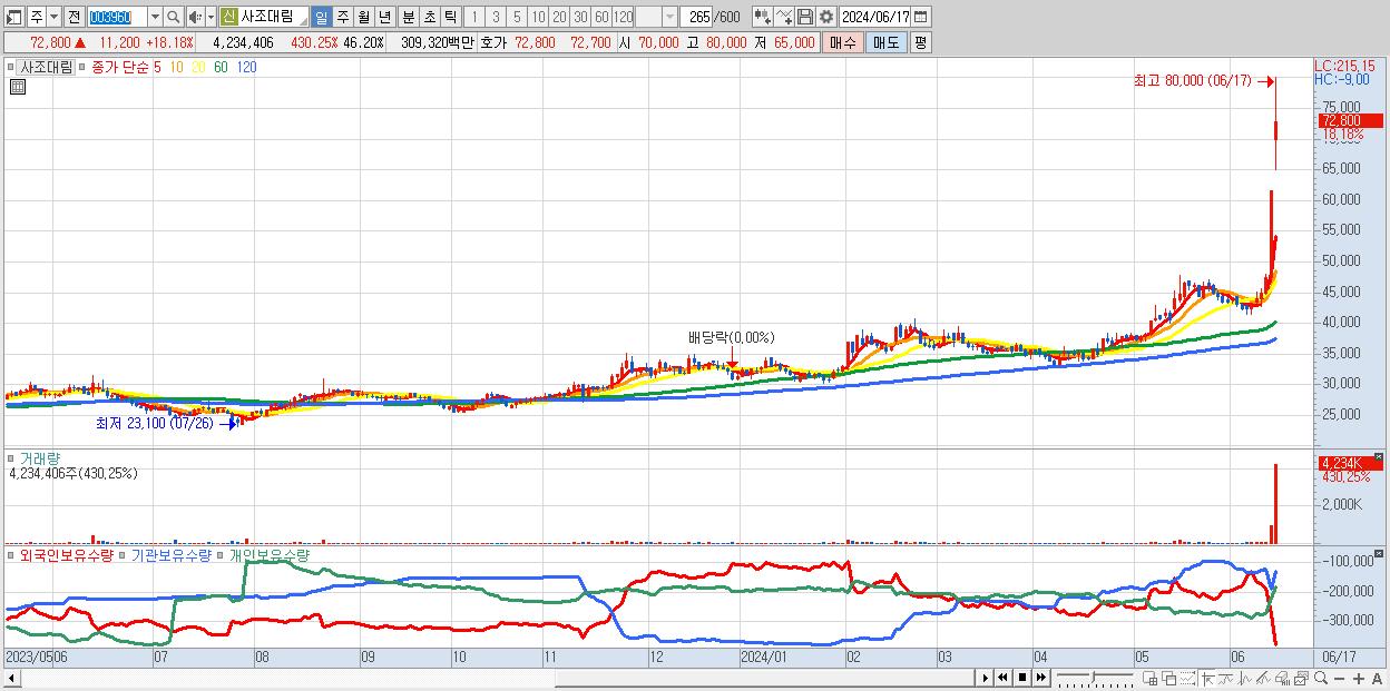- 사조대림 (72,800원 ▲ 18.18% , 시총: 6,672억, 거래량: 4,234,406, 거래대금:3,093억)