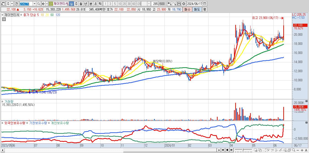 - 제이앤티씨 (22,100원 ▲ 16.62% , 시총: 12,785억, 거래량: 15,393,228, 거래대금:3,454억)