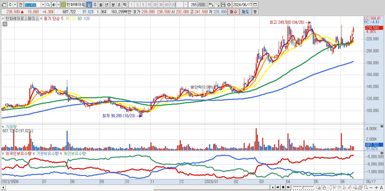 - 한화에어로스페이스 (238,500원 ▲ 4.38% , 시총: 120,753억, 거래량: 687,722, 거래대금:1,633억)