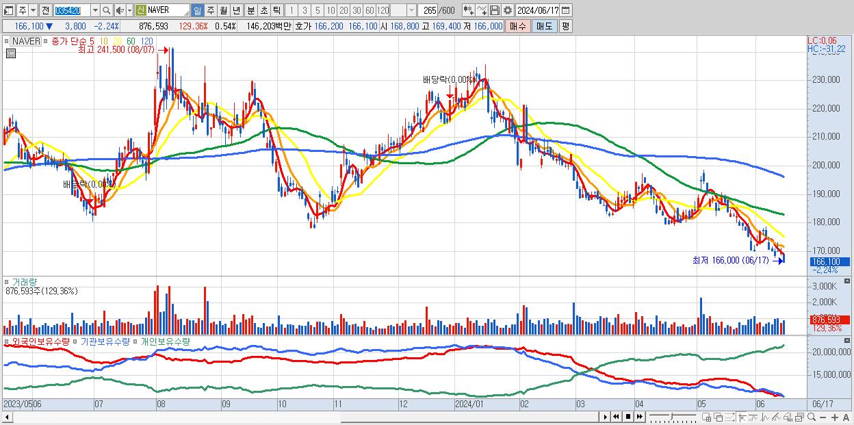 - NAVER (166,100원 ▼ -2.24% , 시총: 269,761억, 거래량: 876,593, 거래대금:1,462억)