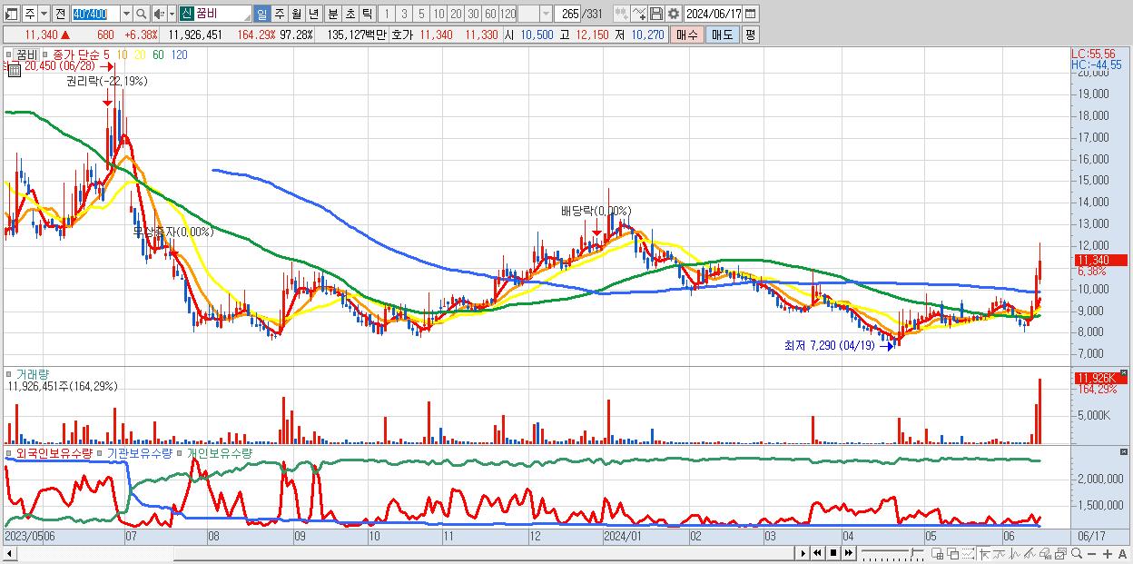 - 꿈비 (11,340원 ▲ 6.38% , 시총: 1,390억, 거래량: 11,926,451, 거래대금:1,351억)