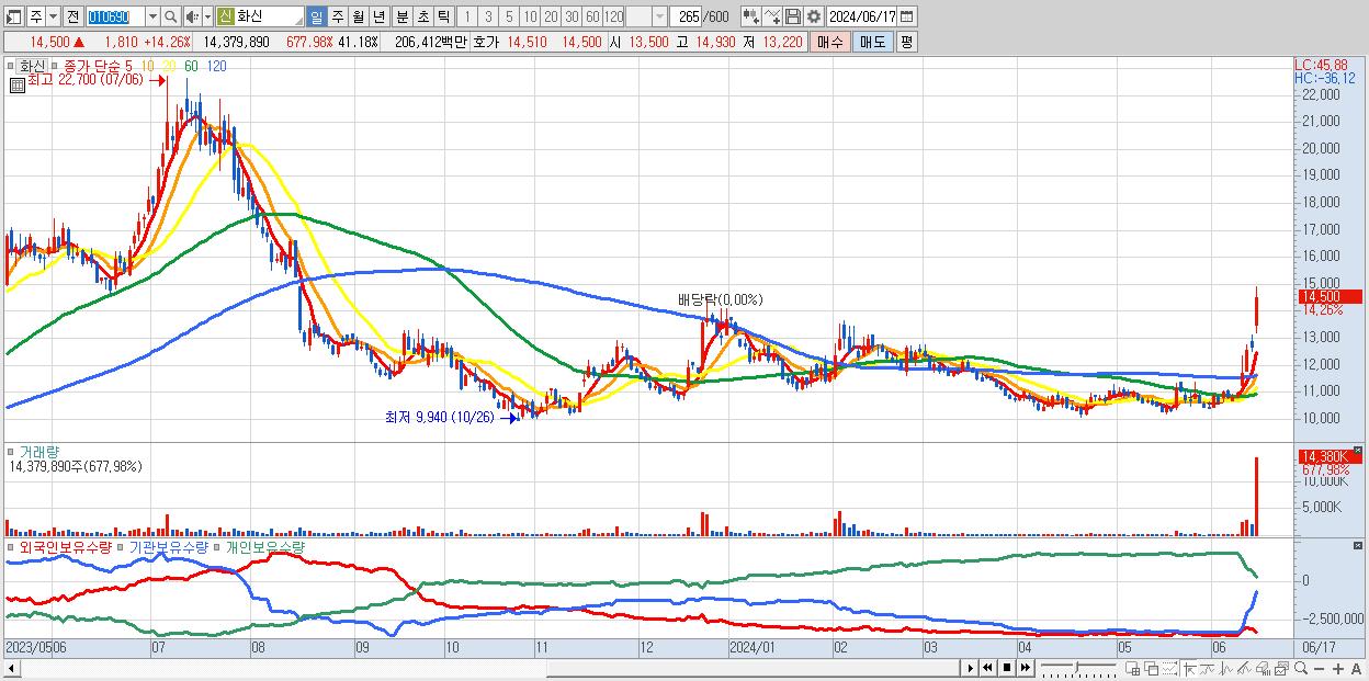 - 화신 (14,500원 ▲ 14.26% , 시총: 5,063억, 거래량: 14,379,890, 거래대금:2,064억)