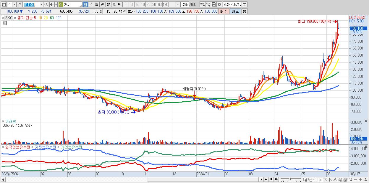 - SKC (188,100원 ▼ -3.69% , 시총: 71,230억, 거래량: 686,495, 거래대금:1,313억)