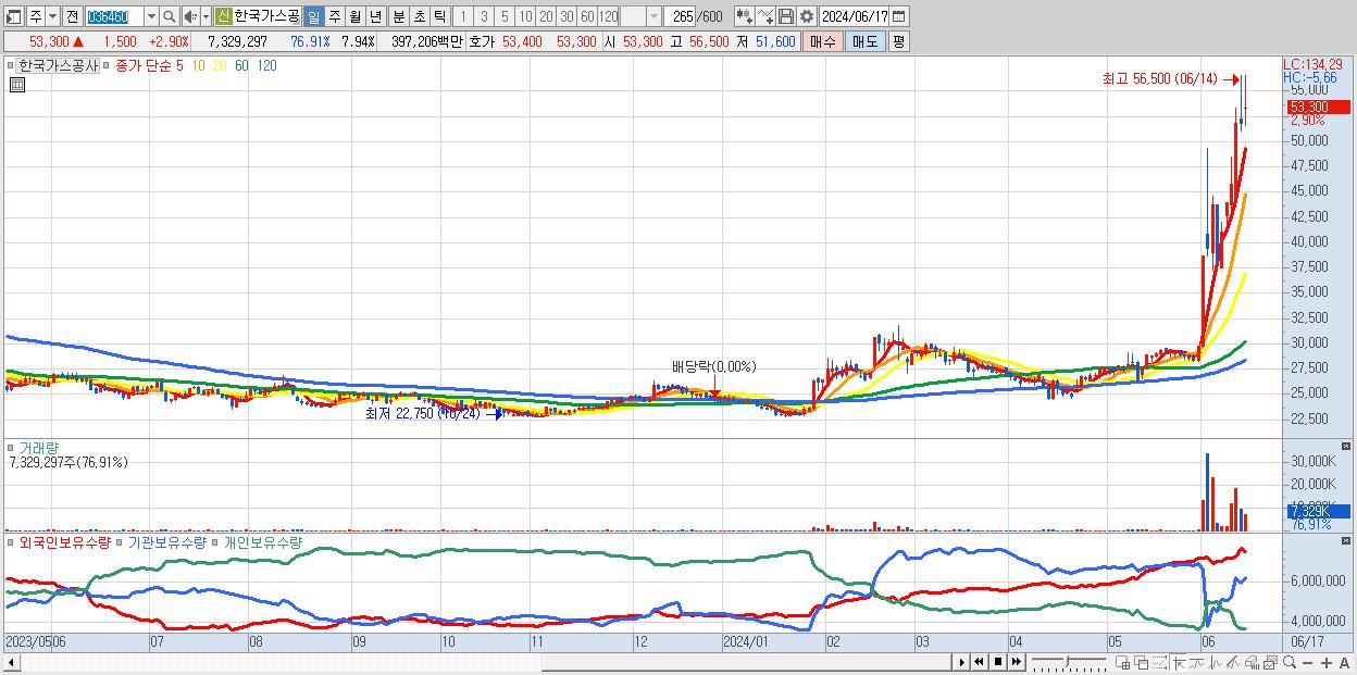 - 한국가스공사 (53,300원 ▲ 2.9% , 시총: 49,203억, 거래량: 7,329,297, 거래대금:3,972억)