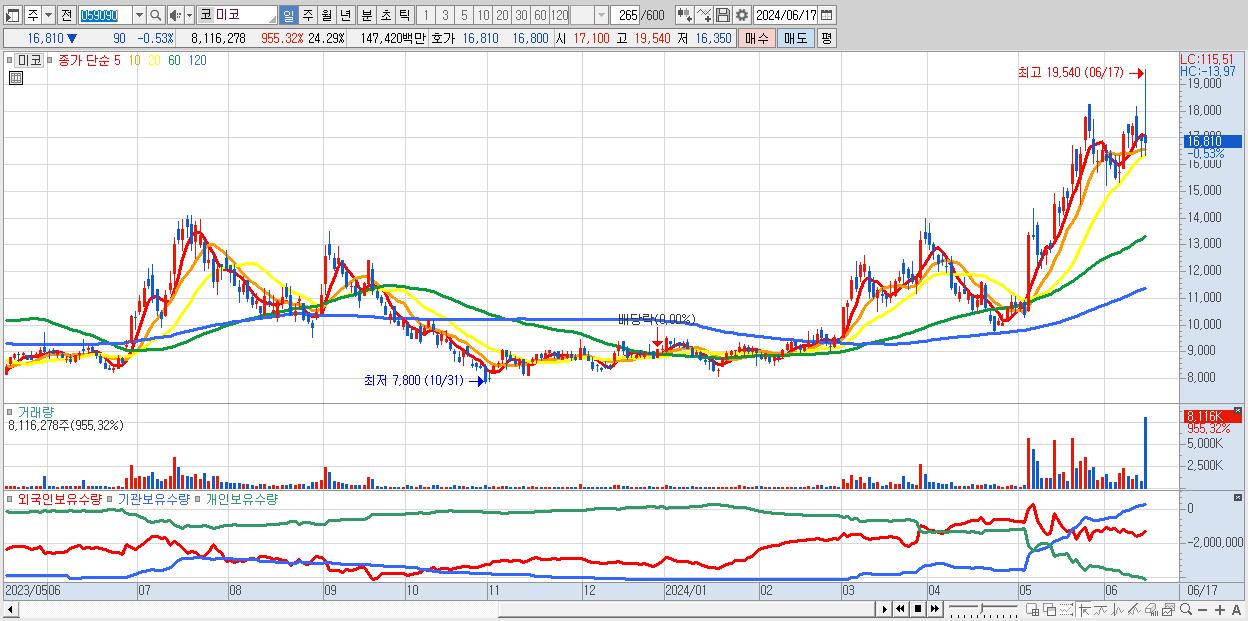 - 미코 (16,810원 ▼ -0.53% , 시총: 5,617억, 거래량: 8,116,278, 거래대금:1,474억)
