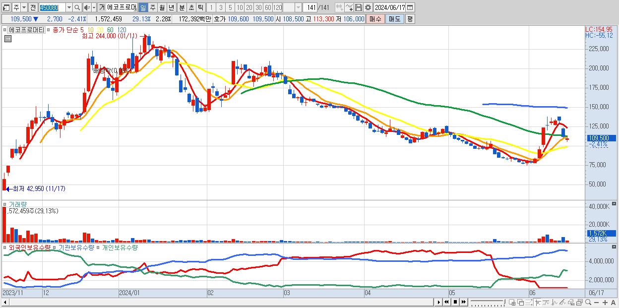 - 에코프로머티 (109,500원 ▼ -2.41% , 시총: 75,539억, 거래량: 1,572,459, 거래대금:1,724억)
