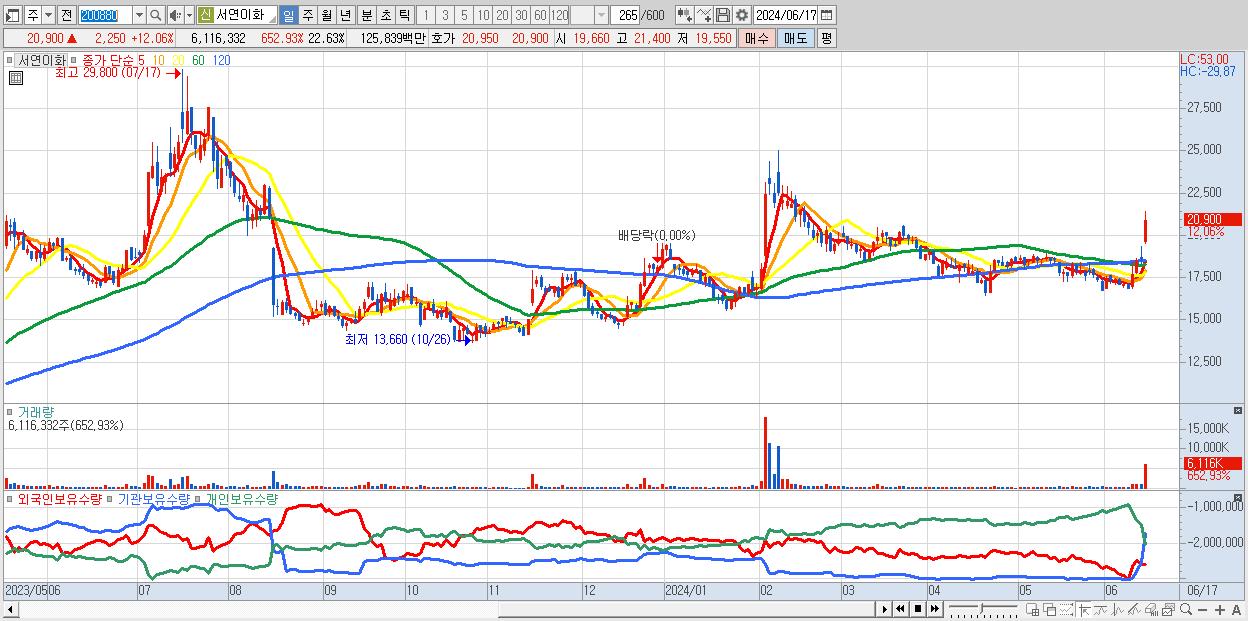 - 서연이화 (20,900원 ▲ 12.06% , 시총: 5,649억, 거래량: 6,116,332, 거래대금:1,258억)