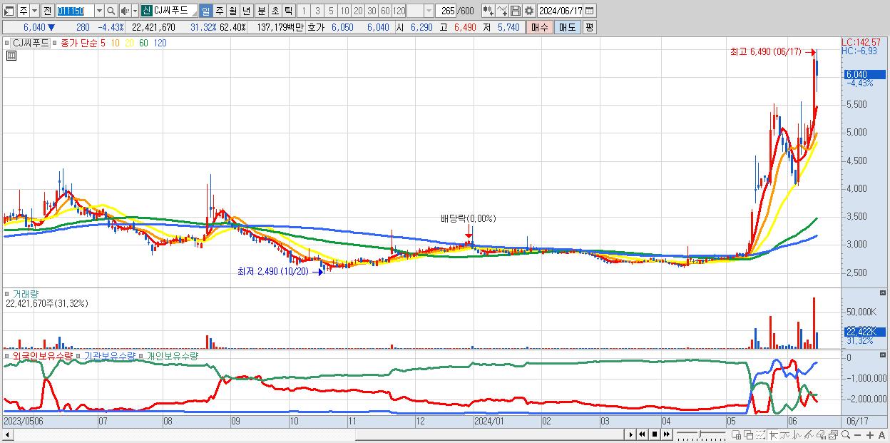 - CJ씨푸드 (6,040원 ▼ -4.43% , 시총: 2,170억, 거래량: 22,421,670, 거래대금:1,372억)