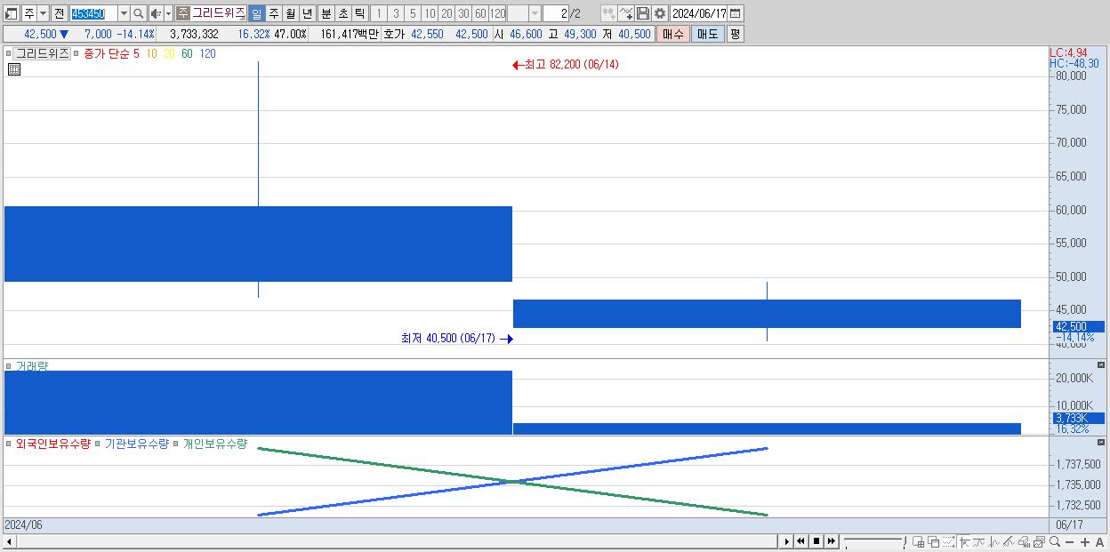 - 그리드위즈 (42,500원 ▼ -14.14% , 시총: 3,376억, 거래량: 3,733,332, 거래대금:1,614억)