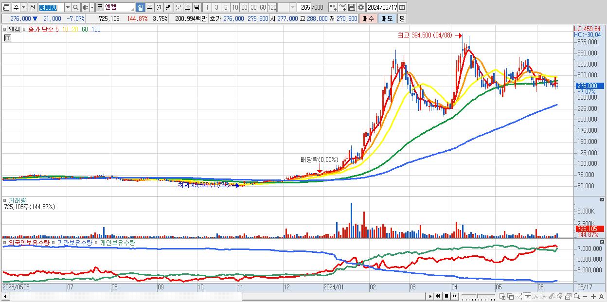 - 엔켐 (276,000원 ▼ -7.07% , 시총: 53,428억, 거래량: 725,105, 거래대금:2,010억)