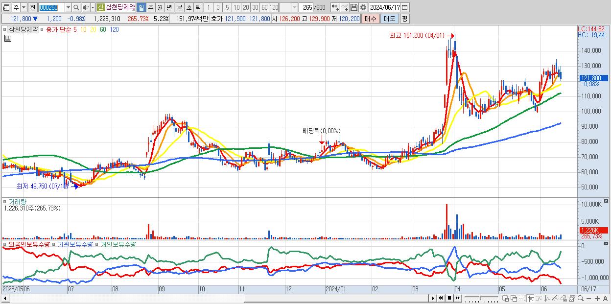 - 삼천당제약 (121,800원 ▼ -0.98% , 시총: 28,571억, 거래량: 1,226,310, 거래대금:1,520억)