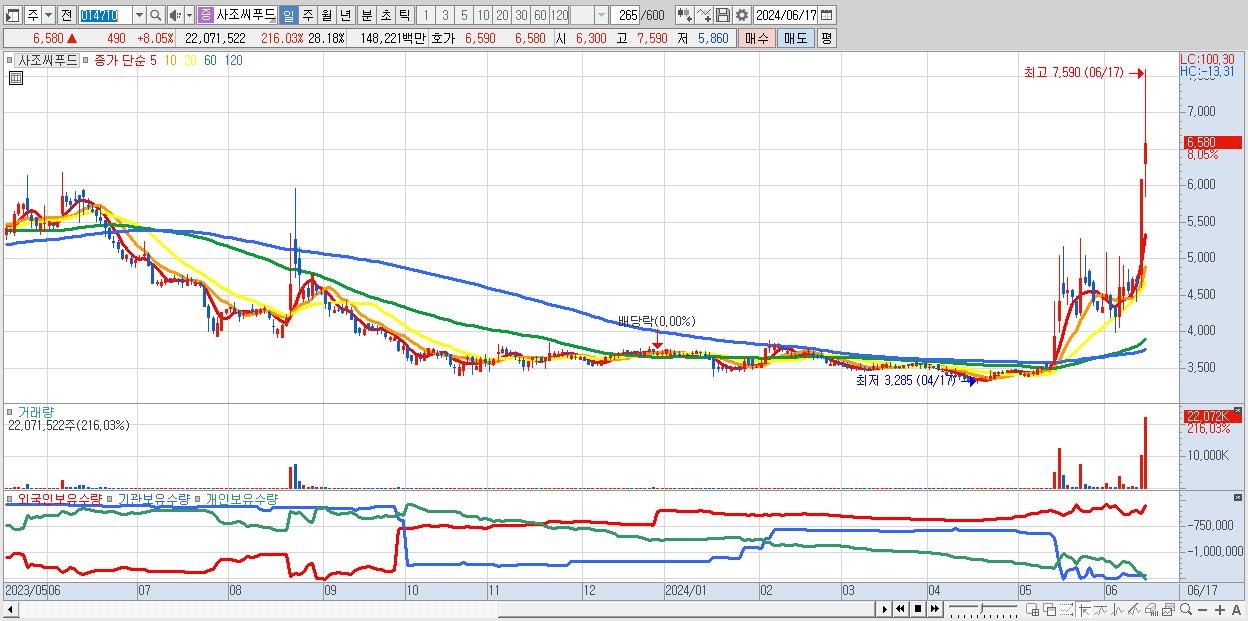 - 사조씨푸드 (6,580원 ▲ 8.05% , 시총: 1,133억, 거래량: 22,071,522, 거래대금:1,482억)