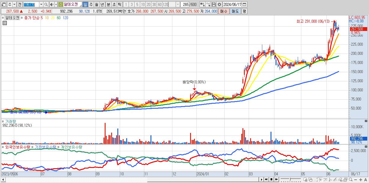 - 알테오젠 (267,500원 ▲ 0.94% , 시총: 142,172억, 거래량: 992,296, 거래대금:2,695억)