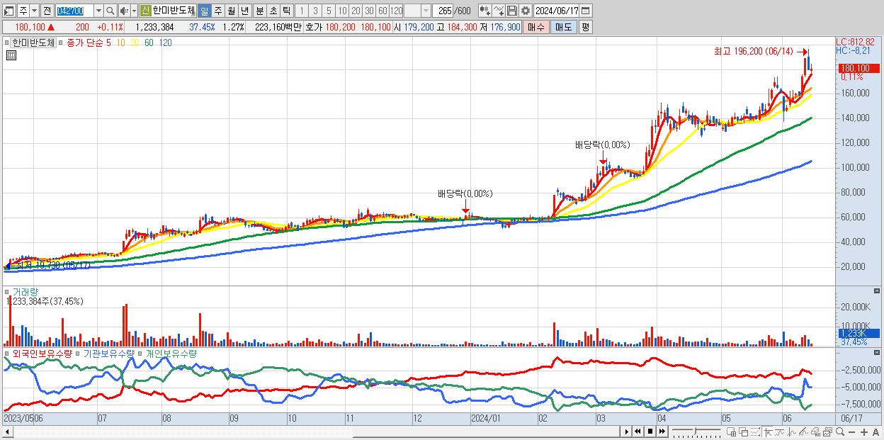 - 한미반도체 (180,100원 ▲ 0.11% , 시총: 174,686억, 거래량: 1,233,384, 거래대금:2,232억)