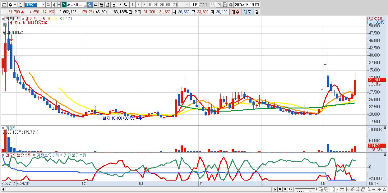 - 씨싸이트 (31,700원 ▲ 17.19% , 시총: 1,811억, 거래량: 2,662,103, 거래대금:831억)