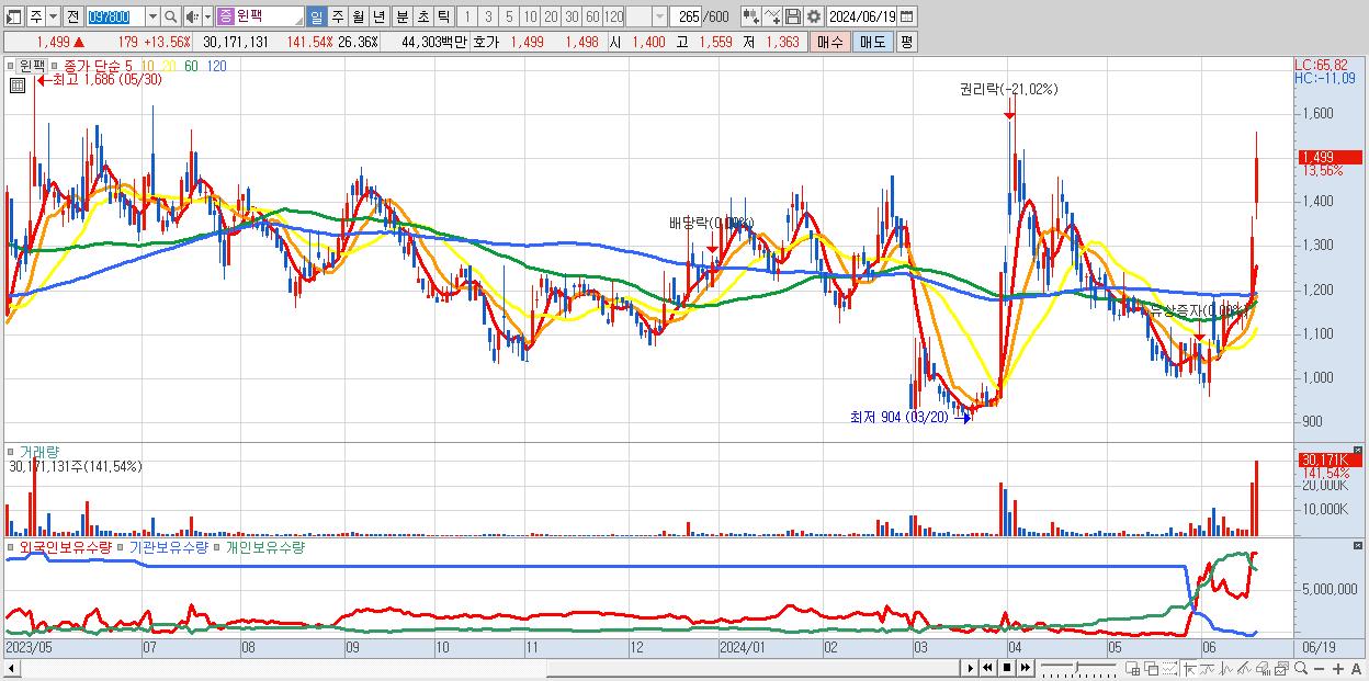 - 윈팩 (1,499원 ▲ 13.56% , 시총: 1,716억, 거래량: 30,171,131, 거래대금:443억)