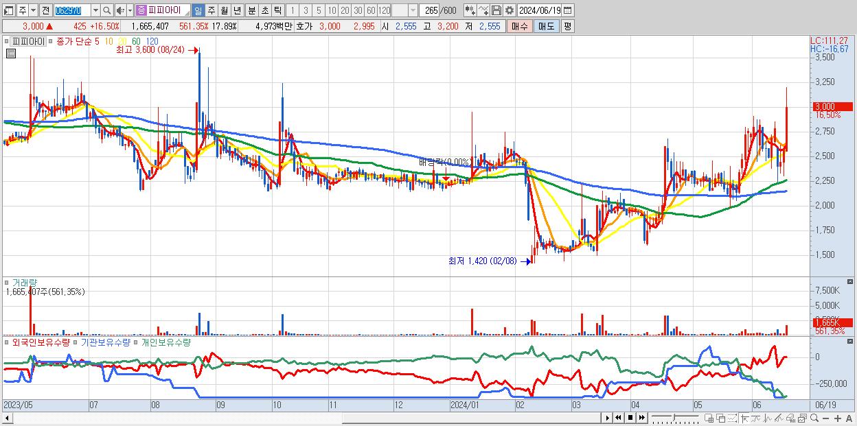 - 피피아이 (3,000원 ▲ 16.5% , 시총: 279억, 거래량: 1,665,407, 거래대금:50억)