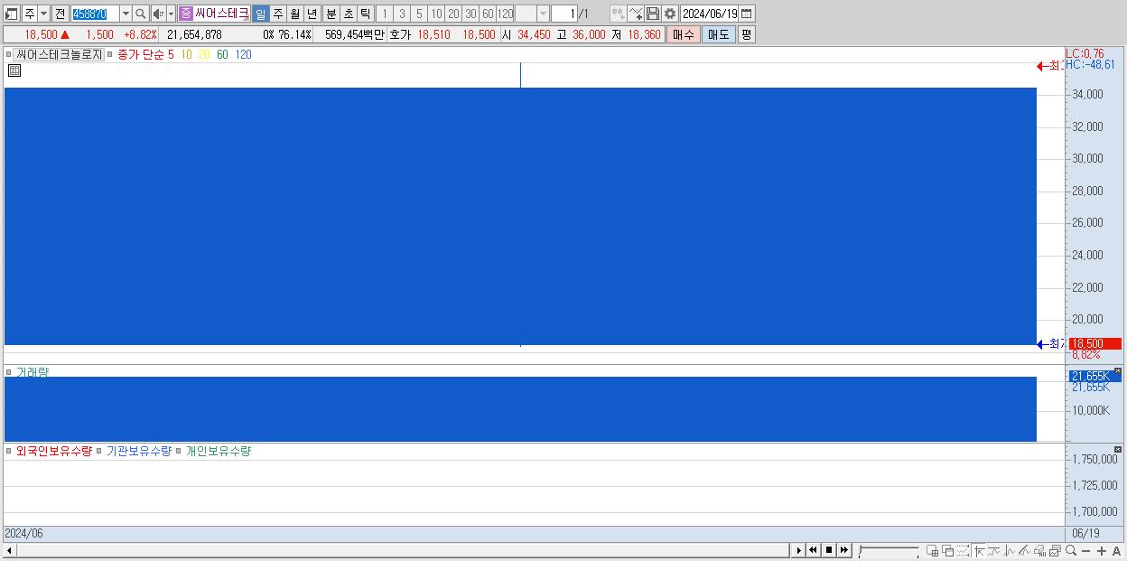 - 씨어스테크놀로지 (18,500원 ▲ 8.82% , 시총: 2,274억, 거래량: 21,654,878, 거래대금:5,695억)