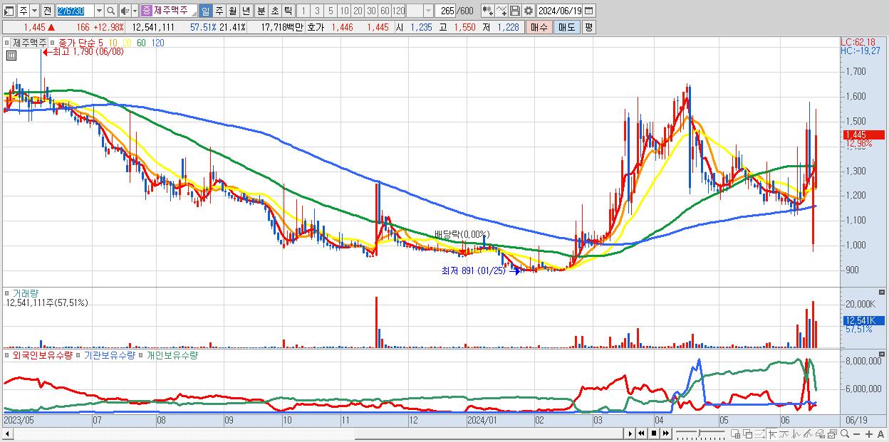 - 제주맥주 (1,445원 ▲ 12.98% , 시총: 846억, 거래량: 12,541,111, 거래대금:177억)
