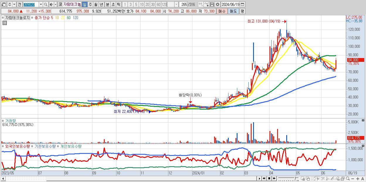 - 자람테크놀로지 (84,000원 ▲ 15.38% , 시총: 5,206억, 거래량: 614,775, 거래대금:513억)