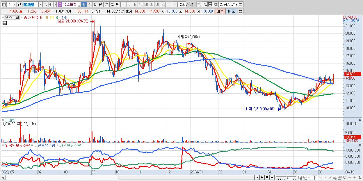 - 넥스트칩 (14,600원 ▲ 9.45% , 시총: 2,641억, 거래량: 1,034,391, 거래대금:144억)