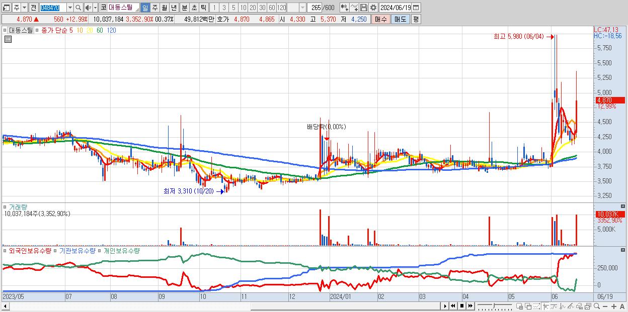 - 대동스틸 (4,870원 ▲ 12.99% , 시총: 487억, 거래량: 10,037,184, 거래대금:498억)