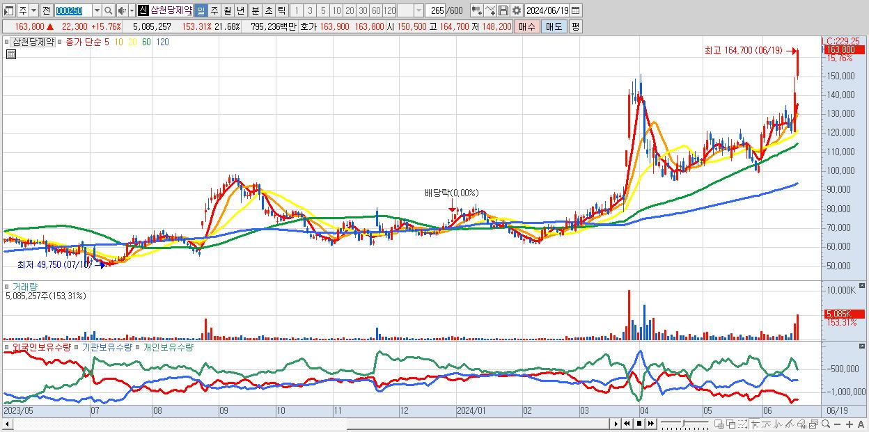 - 삼천당제약 (163,800원 ▲ 15.76% , 시총: 38,423억, 거래량: 5,085,257, 거래대금:7,952억)