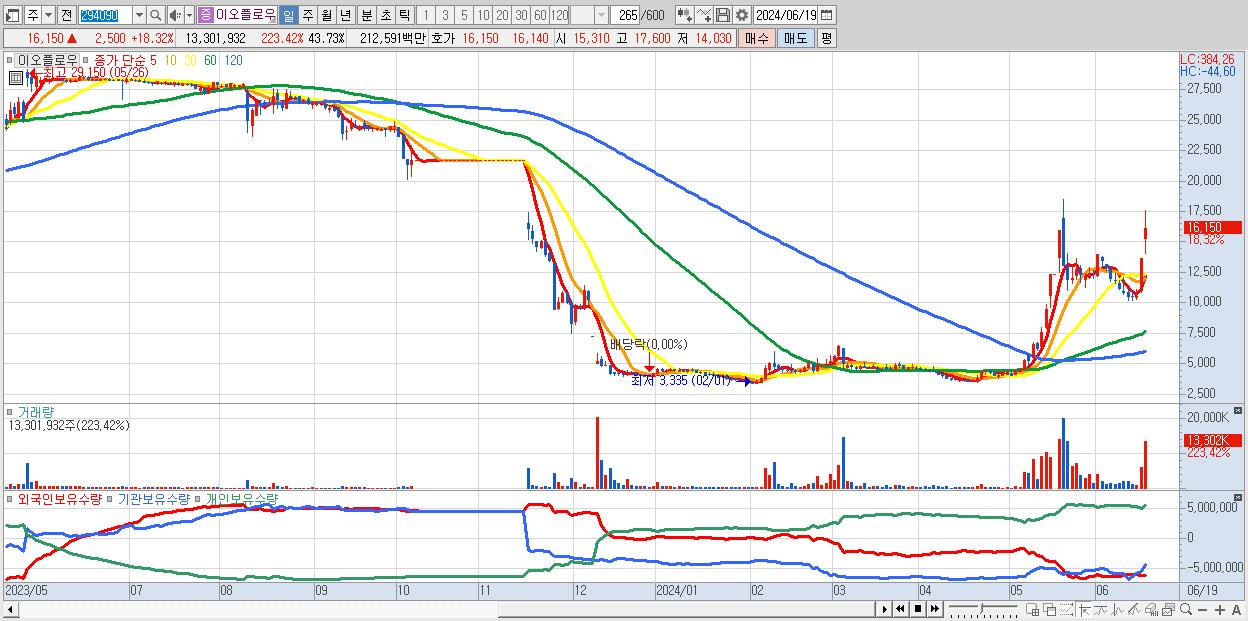 - 이오플로우 (16,150원 ▲ 18.32% , 시총: 4,912억, 거래량: 13,301,932, 거래대금:2,126억)