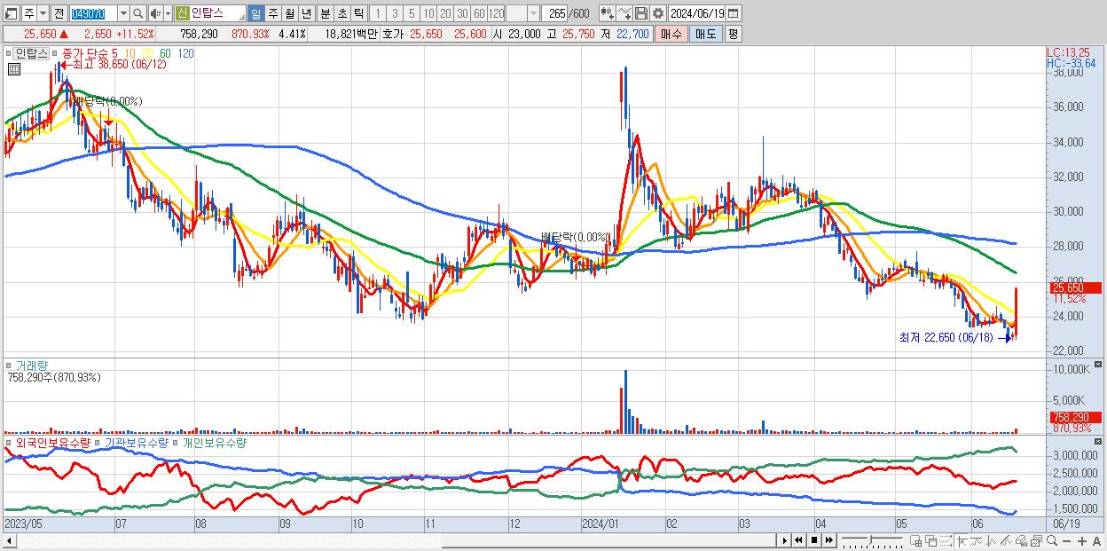 - 인탑스 (25,650원 ▲ 11.52% , 시총: 4,412억, 거래량: 758,290, 거래대금:188억)