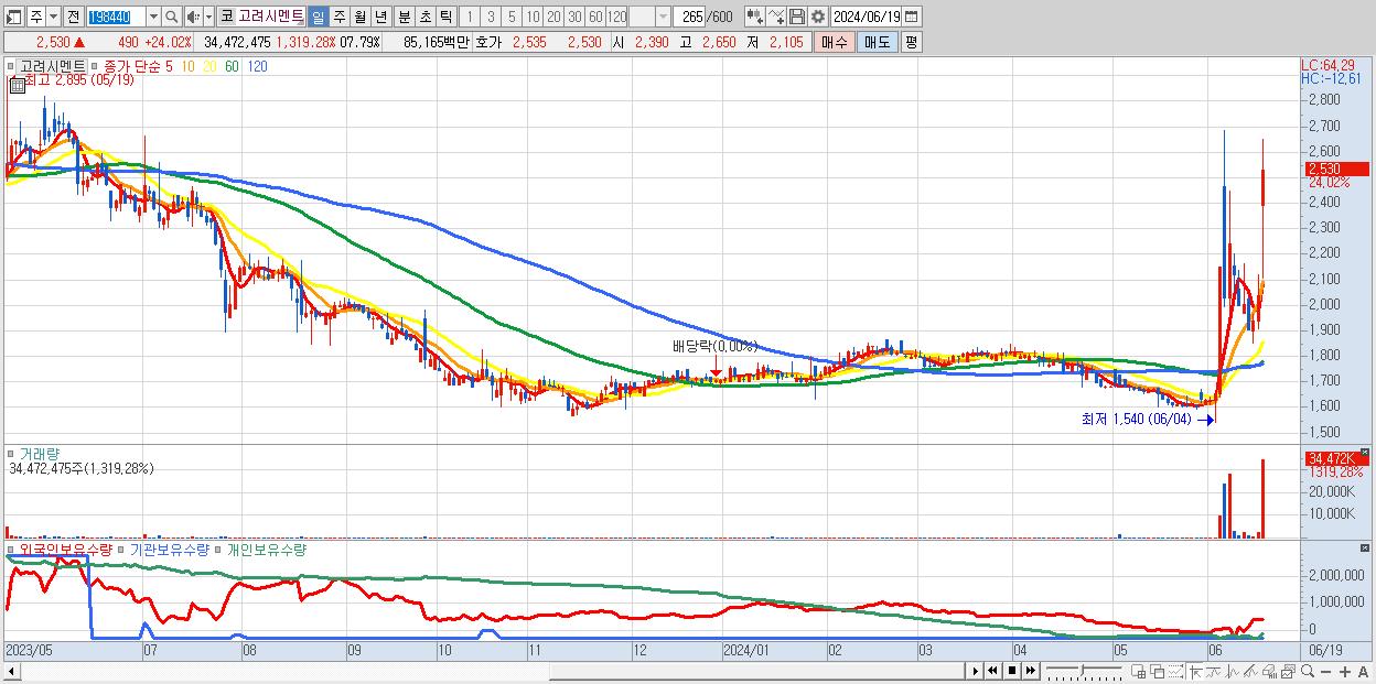- 고려시멘트 (2,530원 ▲ 24.02% , 시총: 809억, 거래량: 34,472,475, 거래대금:852억)