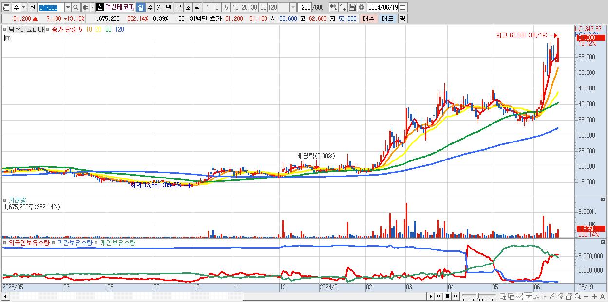 - 덕산테코피아 (61,200원 ▲ 13.12% , 시총: 12,215억, 거래량: 1,675,200, 거래대금:1,001억)