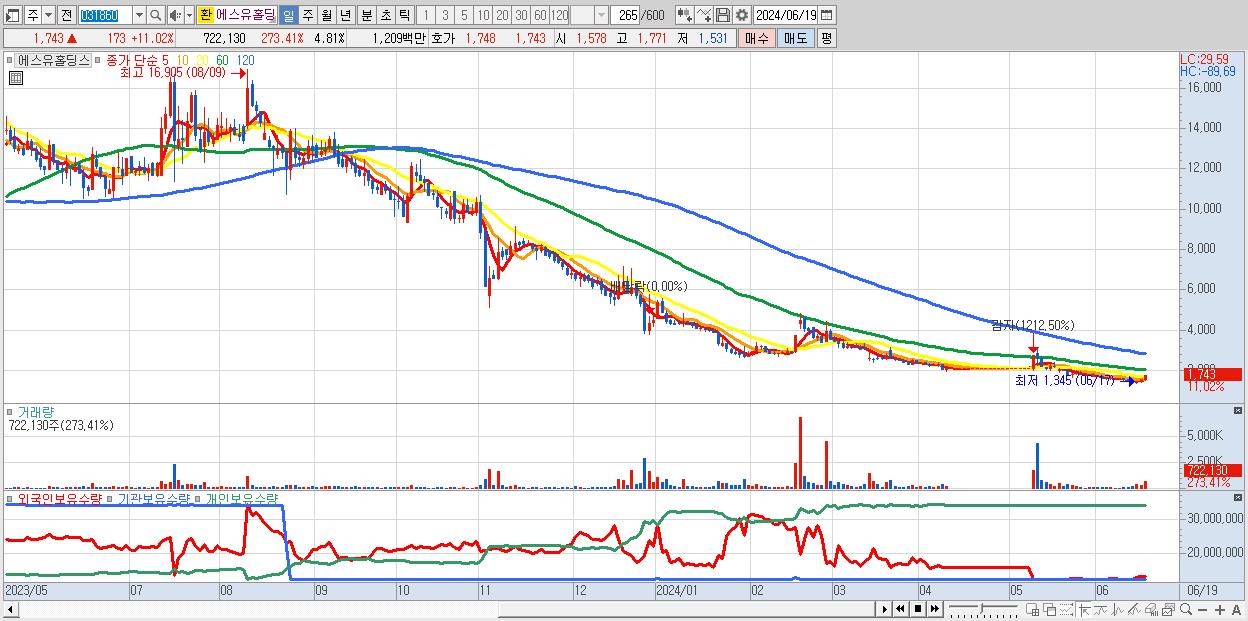 - 에스유홀딩스 (1,743원 ▲ 11.02% , 시총: 262억, 거래량: 722,130, 거래대금:12억)