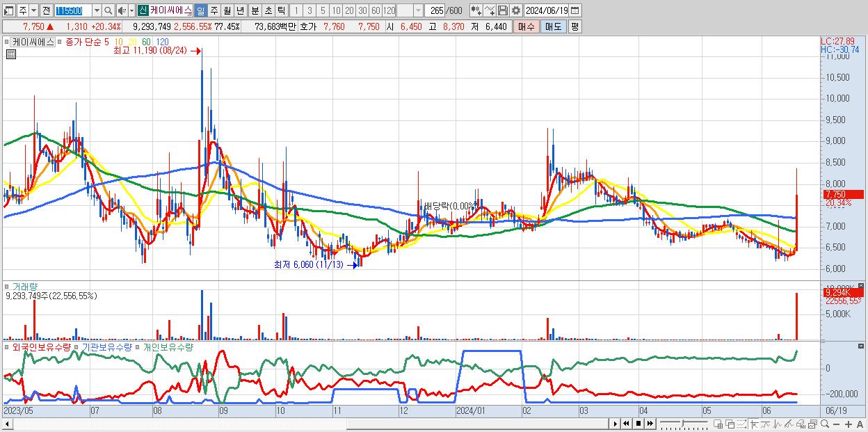 - 케이씨에스 (7,750원 ▲ 20.34% , 시총: 930억, 거래량: 9,293,749, 거래대금:737억)