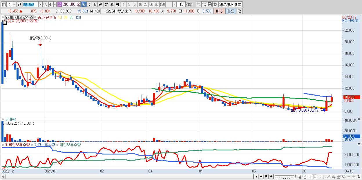 - 와이바이오로직스 (10,450원 ▲ 9.08% , 시총: 1,543억, 거래량: 2,135,952, 거래대금:220억)