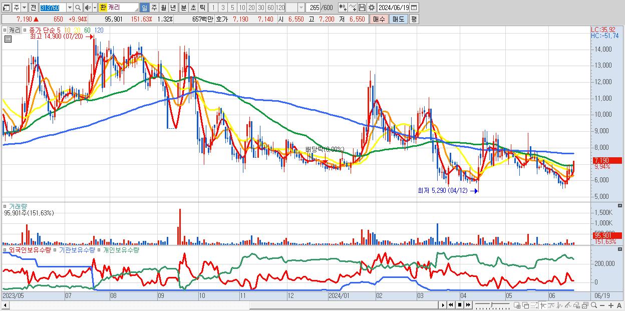 - 캐리 (7,190원 ▲ 9.94% , 시총: 524억, 거래량: 95,901, 거래대금:7억)
