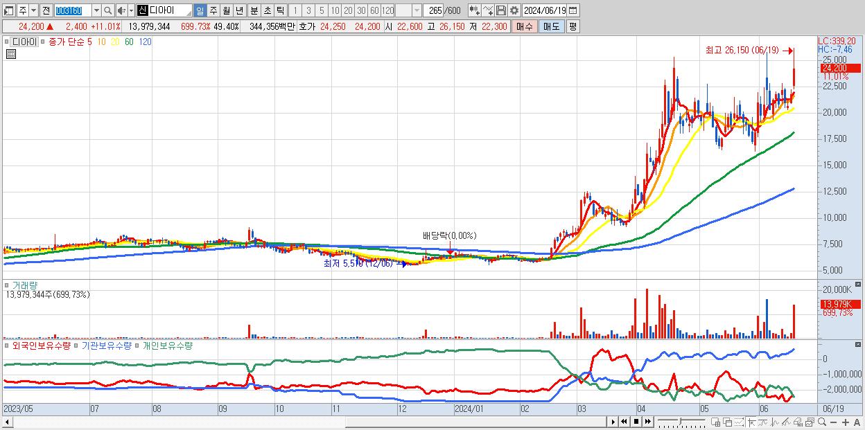 - 디아이 (24,200원 ▲ 11.01% , 시총: 6,849억, 거래량: 13,979,344, 거래대금:3,444억)
