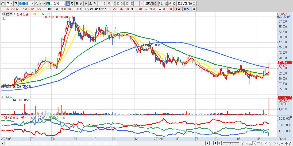 - 이엠텍 (37,750원 ▲ 23.97% , 시총: 6,468억, 거래량: 3,101,193, 거래대금:1,152억)