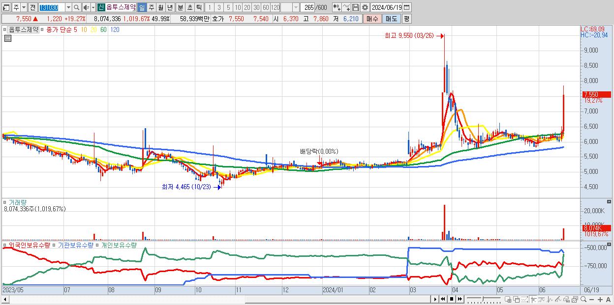 - 옵투스제약 (7,550원 ▲ 19.27% , 시총: 1,220억, 거래량: 8,074,336, 거래대금:589억)