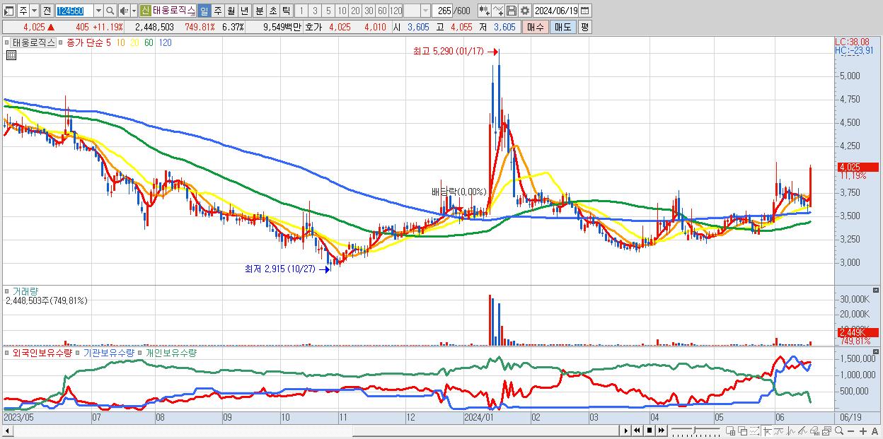 - 태웅로직스 (4,025원 ▲ 11.19% , 시총: 1,546억, 거래량: 2,448,503, 거래대금:95억)