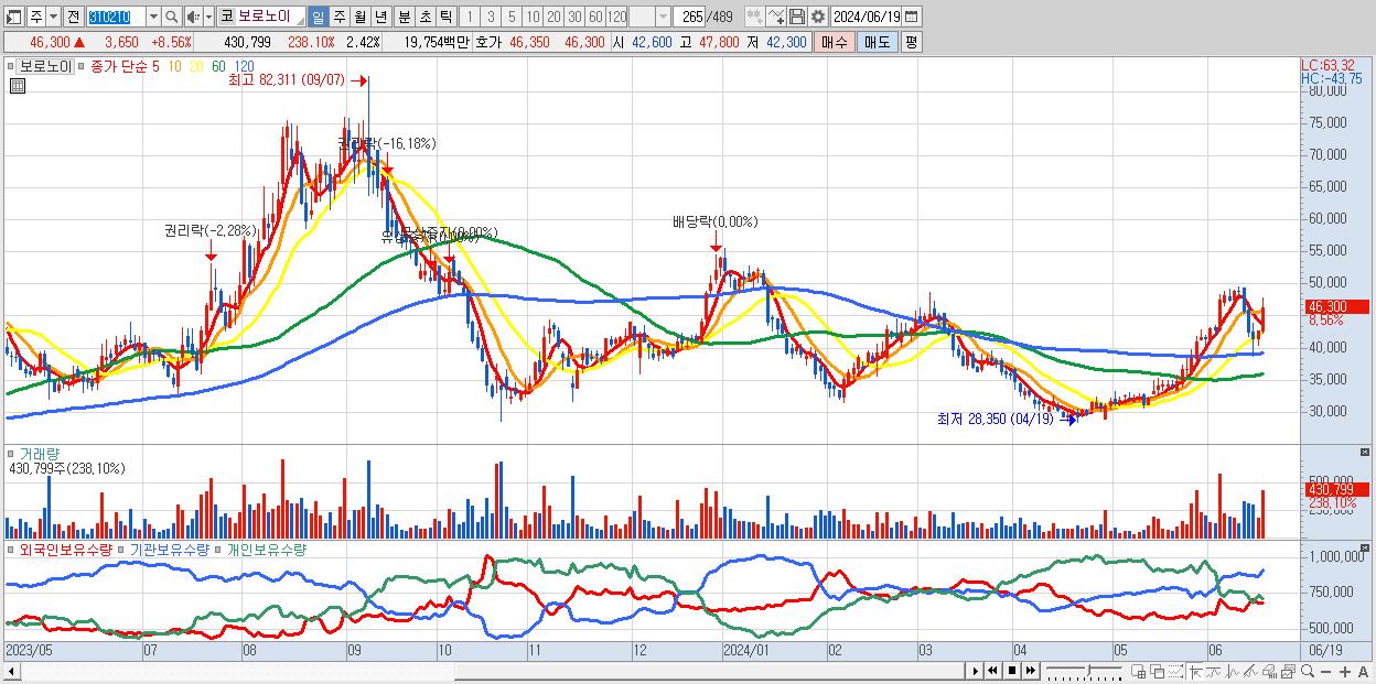 - 보로노이 (46,300원 ▲ 8.56% , 시총: 8,232억, 거래량: 430,799, 거래대금:198억)