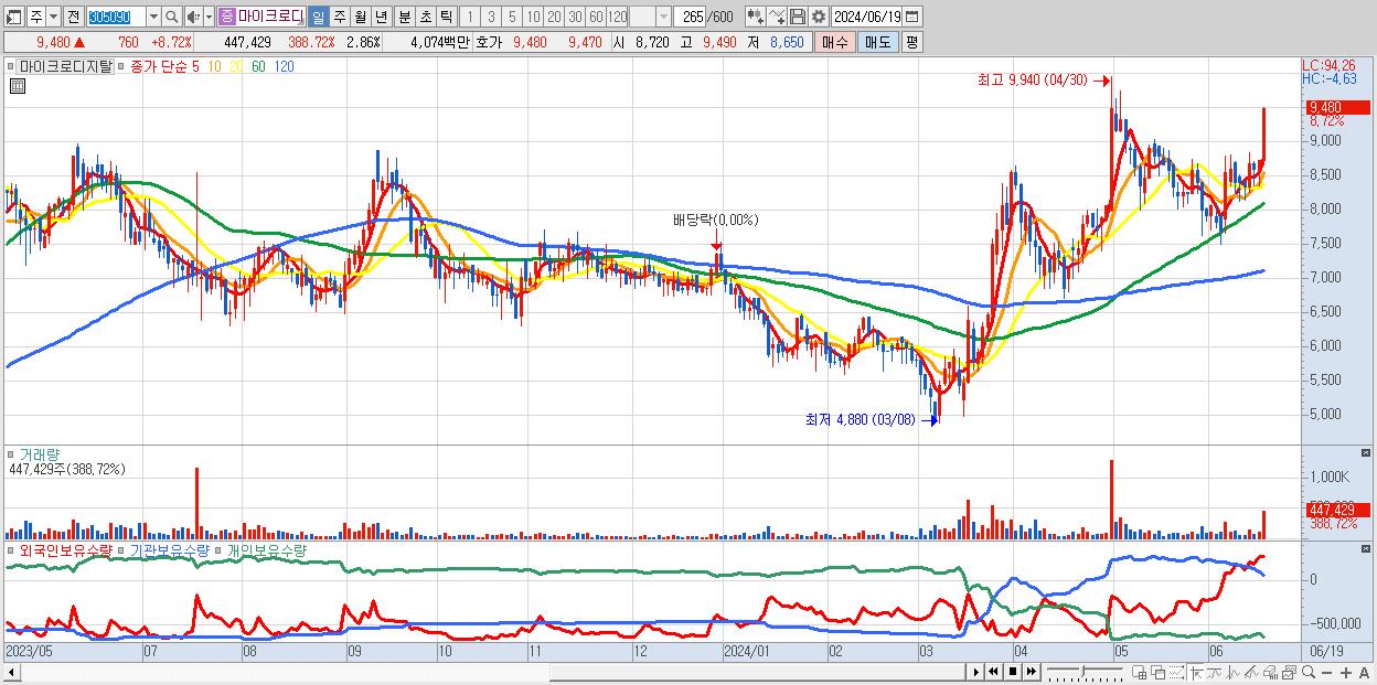- 마이크로디지탈 (9,480원 ▲ 8.72% , 시총: 1,482억, 거래량: 447,429, 거래대금:41억)